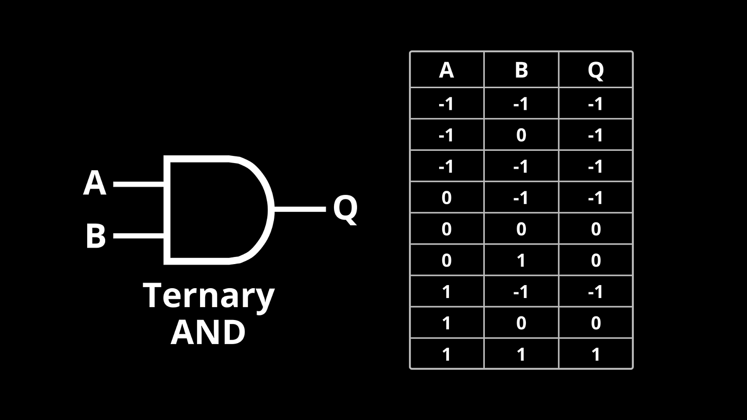 In ternary, things get spicy. Each input can be –1, 0, or +1. In binary, there are only 4 combinations. In ternary, you get 27. And in this setup, the ternary AND gate just returns the lowest value.