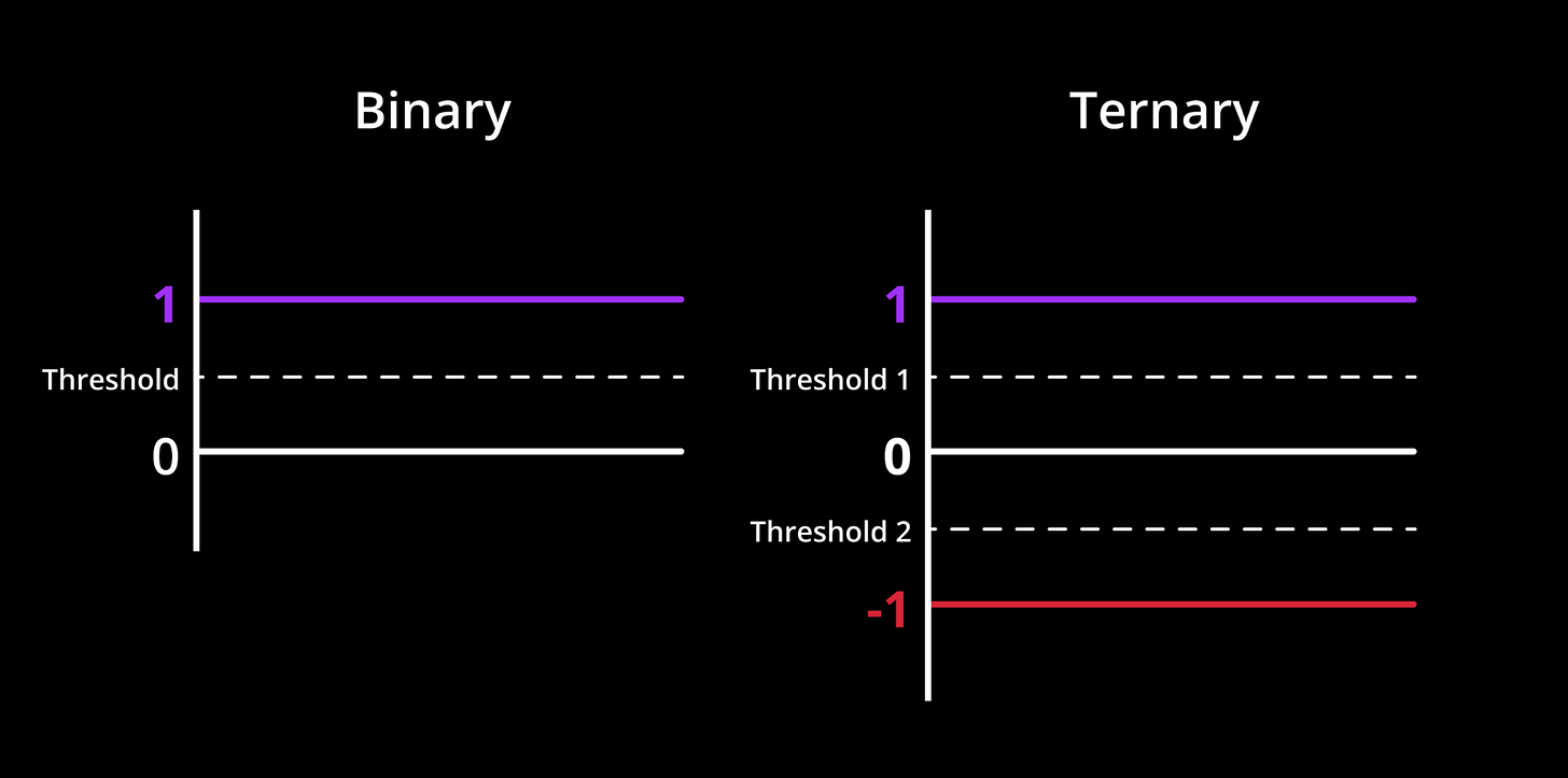 Compared to binary, each input now carries more information. That means higher information density, you can do more with the same number of wires. Circuits that are more compact, more efficient, and need fewer parts.